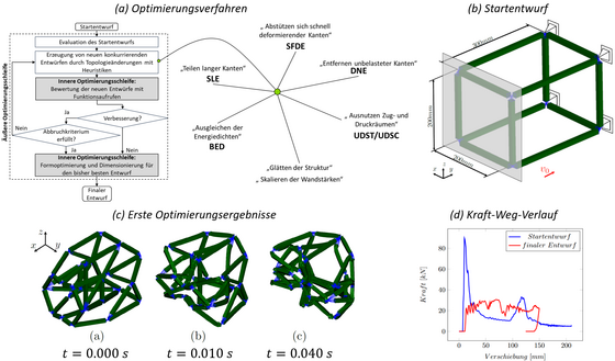 Gesamtziel des Forschungsvorhabens ist die praktische Topologieoptimierung zur Layout-Findung von dreidimensionalen crashbelasteten Strukturen. Die Anwendung soll für unterschiedliche Lastfälle und Optimierungsziele entwickelt werden. Damit sollen Optimierungsziele, wie die Kontaktkraftminimierung oder die Minimierung der Strukturmasse bei gegeben Restriktionen möglich sein. Weiterhin sind in den Teilaspekten die Entwicklung neuer Heuristiken, eine Erweiterung der flexiblen Graphen-Syntax und die Integration in möglichst realitätsnahe Simulationsmodelle enthalten. Im Zuge dessen soll eine Berücksichtigung von non-Designräumen im Optimierungsverlauf integriert sein.
