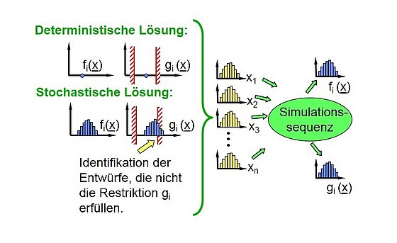 Oft finden Optimierungsalgorithmen Lösungen, die von „Hand“ nicht gefunden werden können. Es kann aber sein, dass die gefundenen Lösungen überhaupt nicht robust sind. Kleinste Änderungen der Einflussgrößen verschlechtern dann die Eigenschaften fundamental. Deshalb werden die Streuungen der Einflussgrößen (Materialkennwerte, Lastfälle, Wanddicken usw. ) direkt in der Optimierung berücksichtigt. Somit erhält man robuste Ergebnisse.