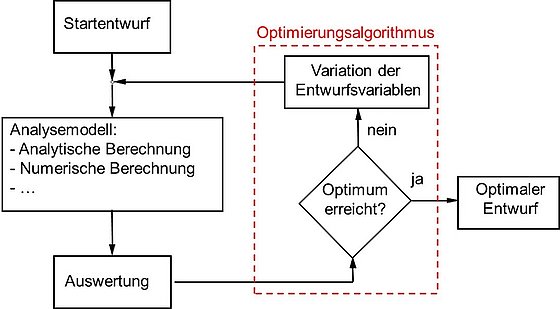 Die automatische Bauteiloptimierung integriert die Simulationssequenz in eine Optimierungsschleife. Der ausgewählte Optimierungsalgorithmus verändert die definierten Entwurfsvariablen und ermittelt den optimalen Entwurf.